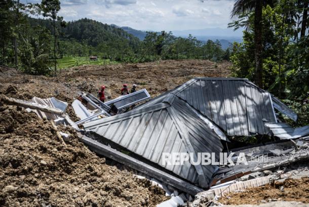 Relawan berjalan di samping puing bangunan yang terdampak bencana tanah longsor di Dusun Situkung, Desa Pandanarum, Kecamatan Pandanarum, Kabupaten Banjarnegara, Jawa Tengah, Selasa (18/11/2025). - (ANTARA FOTO/Aprillio Akbar)