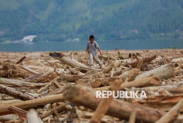Anak bermain di tumpukan kayu yang terbawa arus saat banjir bandang di kampung Waq Toweren, Kecamatan Lut Tawar, Aceh Tengah, Aceh, Sabtu (27/12/2025). Mayoritas penduduk di kampung tersebut berprofesi sebagai petani yang lahannya habis diterjang banjir bandang. - (Erfa News/Thoudy Badai)